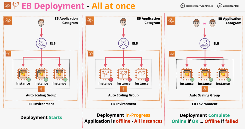 With this deployment type, the new application version is deployed onto all instances in your EB environment at the same time. This means that all instances in the environment are out of service during the deployment, and service is resumed only when the new deployment finishes successfully.