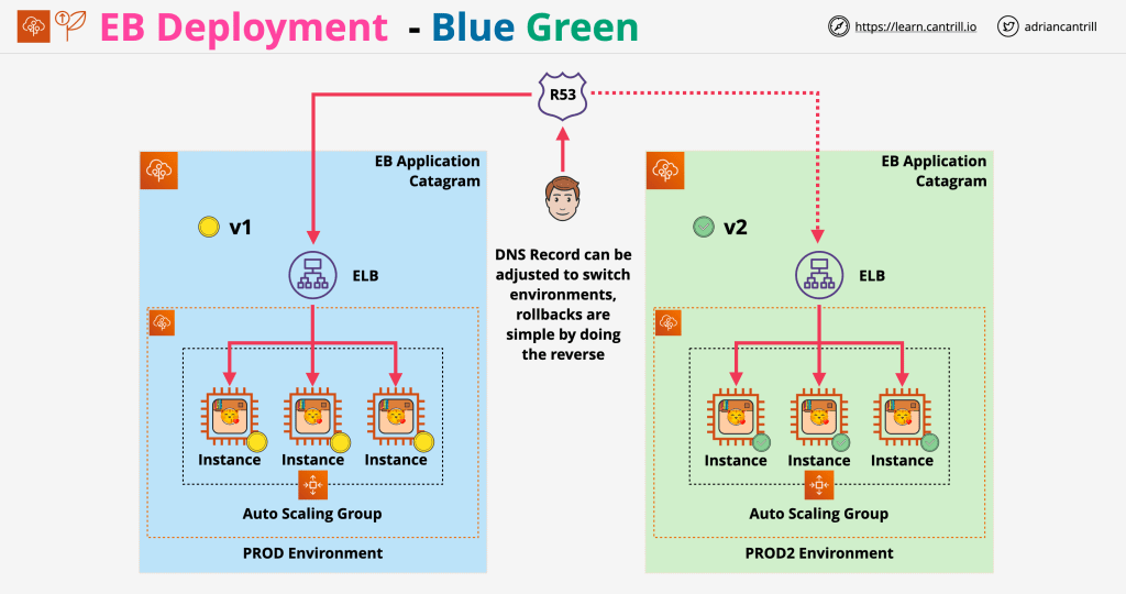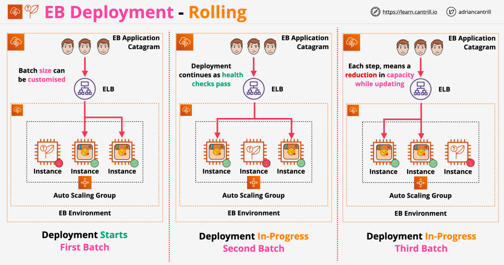 This means that is the easiest to roll back, because a new auto-scaling group is created altogether with instances running the new version of the application; if health-checks pass, then all instances from the auxiliary auto-scaling group are moved into the original one. It also makes it the costliest option, because an entire secondary auto-scaling group created to deploy the new application version to.