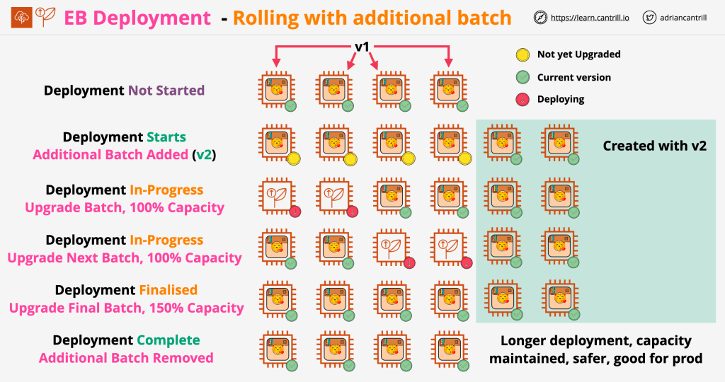 This deployment type is an improvement over the previous one, because it uses the batch size you specified to provision new instances that allows your environment to maintain full capacity during deployment. This means no downtime during deployment, but also means an extra cost for the auxiliary instances being provided.