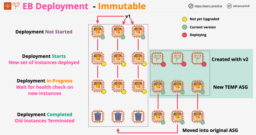 This deployment policy receives its name from the fact that the existing (soon to be old) instances on your environment as treated as immutable. A new auto-scaling group is created with the full number of instances, deployed the new application to, and if health-checks pass, moved to the original ASG.