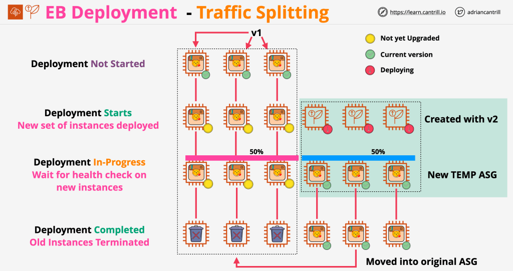 Traffic splitting is similar to the immutable deployment type, but with a key difference: it allows you to split traffic between the previous and the new application instances.